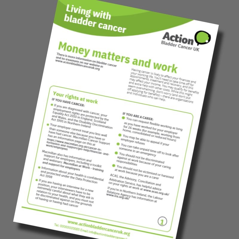An ABC UK Information Sheet - living with bladder cancer can have an impact on earnings and your employment - this sheet gives helpful tips on money and work matters, and where you can find advice and other forms of support available for those with cancer.