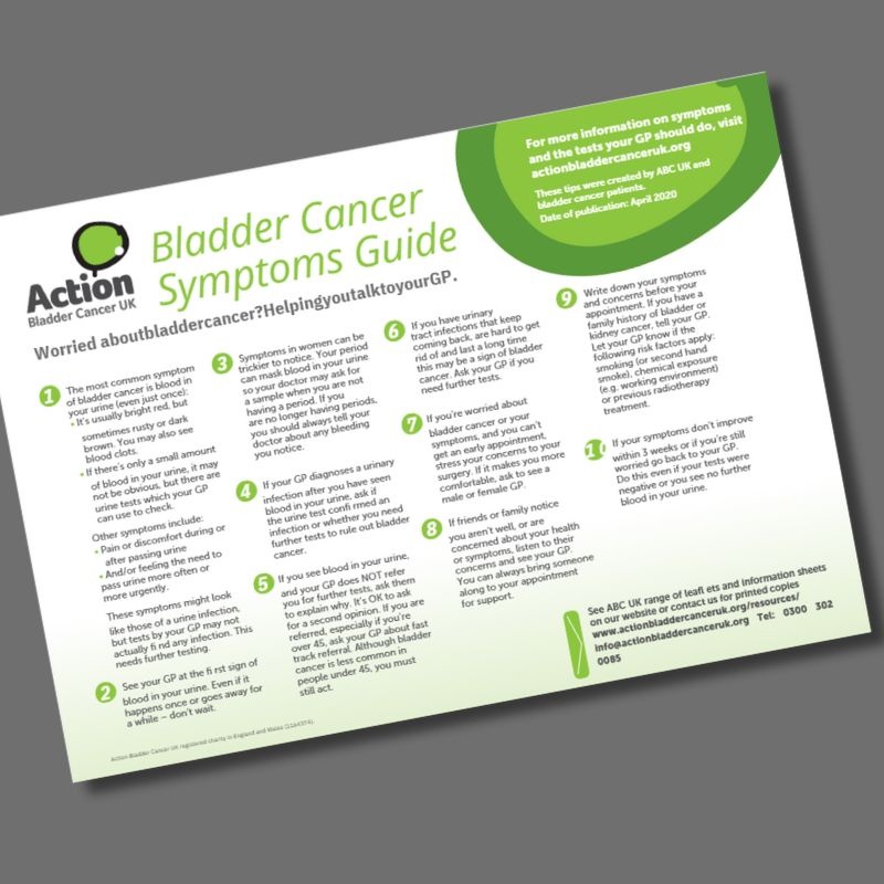 A short guide to raise awareness of the symptoms of bladder cancer. We can also send you printed handout copies. It is also available as an A3 poster.