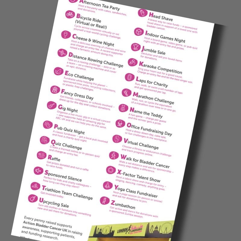 Looking for inspiration to support Action Bladder Cancer UK? We’ve put together an A-Z of fantastic fundraising ideas – there’s something for everyone, whether you want to get active, social, or creative.