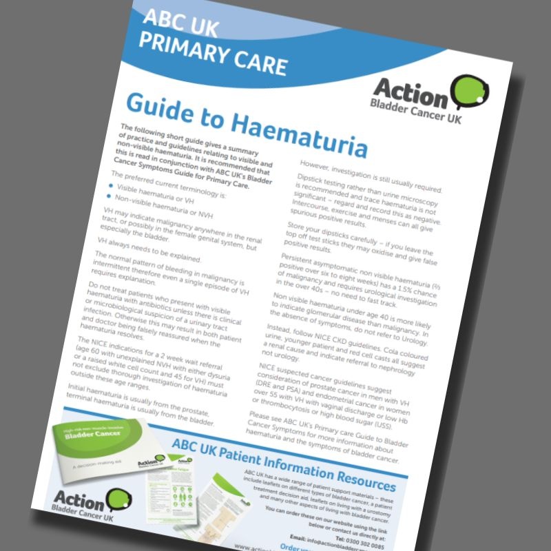 A short guide gives a summary of practice and guidelines relating to visible and non-visible haematuria. It is recommended that this is read in conjunction with ABC UK’s Bladder Cancer Symptoms Guide for Primary Care.